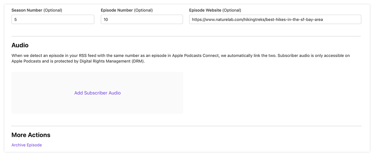 - Создайте новый эпизод в Apple Podcasts Connect и выберите доступ только для ваших подписчиков.