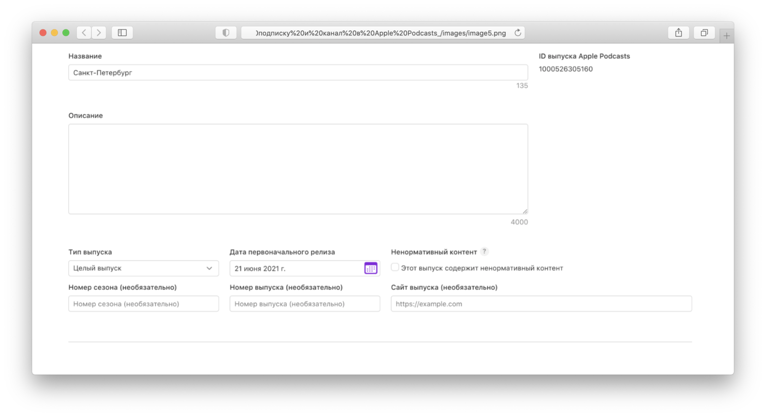 - Прописать один и тот же номер сезона, номер выпуска и его тип как на хостинге, так и в Apple Podcasts Connect.