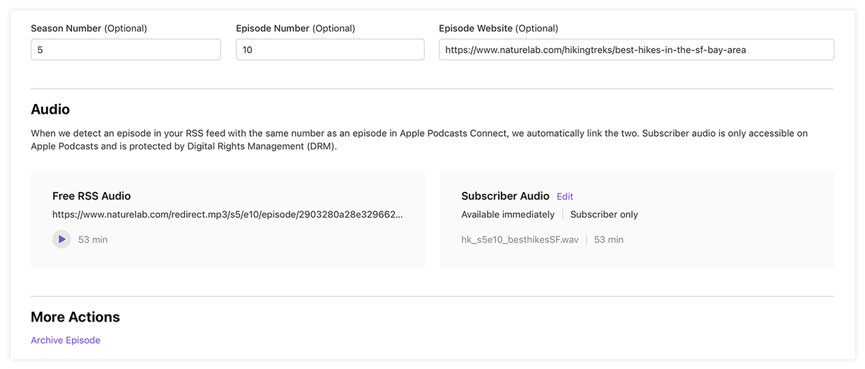 - После того, как Apple подтянет выпуск по RSS, подтвердите связь между платным и бесплатным эпизодами.