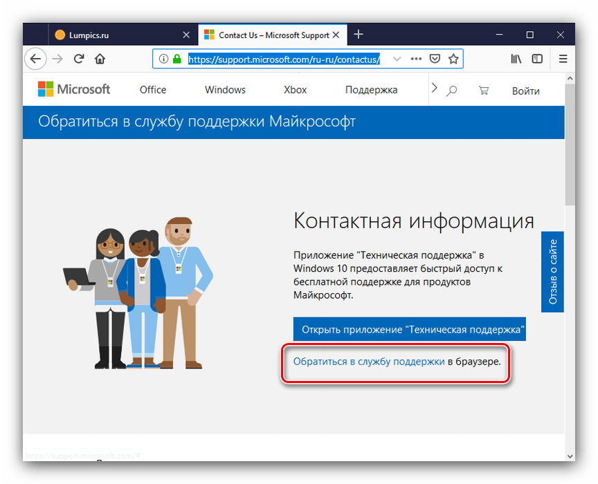 Если же вы не пользуетесь Microsoft Store, обратиться в поддержку можно и с помощью браузера, перейдя по этой гиперссылке , а затем кликнув по пункту «Обратиться в службу поддержки в браузере», который находится в отмеченном на скриншоте ниже месте.