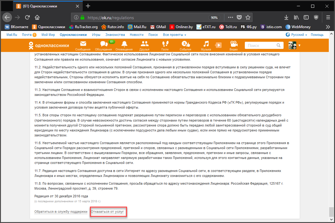 - Следующий этап подразумевает ознакомление с правилами использования социальной сети, в конце которых будет выделена опция «Отказаться от услуг». И именно по ней нужно будет кликнуть, чтобы окончательно избавиться от своей страницы.