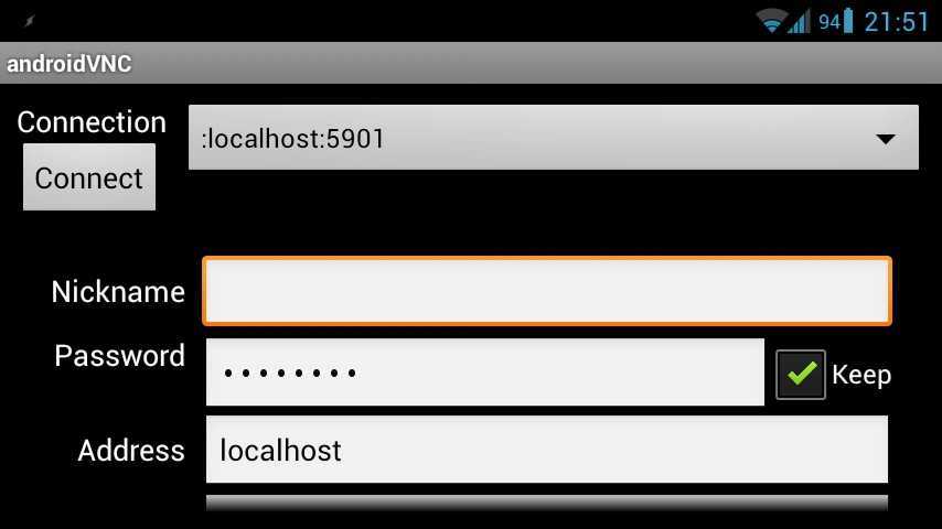 - Устанавливаем на смартфон приложение AndroidVNC, запускаем его, указываем IP-адрес и порт 5901, подключаемся. На экране должен появиться рабочий стол LXDE.