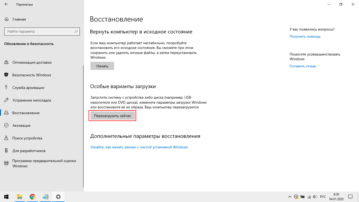 - Еще один способ через Пуск ⇒ Параметры ⇒ Обновление и безопасность ⇒ Восстановление ⇒ Особые варианты загрузки ⇒ Перезагрузить.