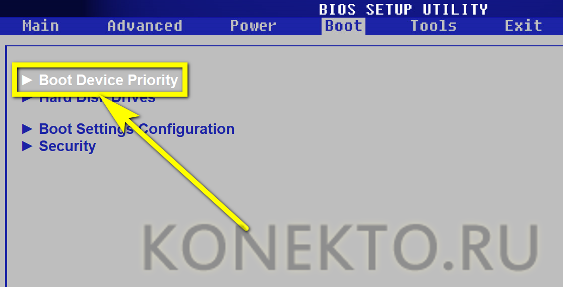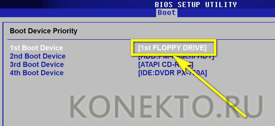 Находим в BIOS опцию, которая отвечает за очередность загрузки устройств. В названии этой опции чаще всего присутствует слово BOOT.