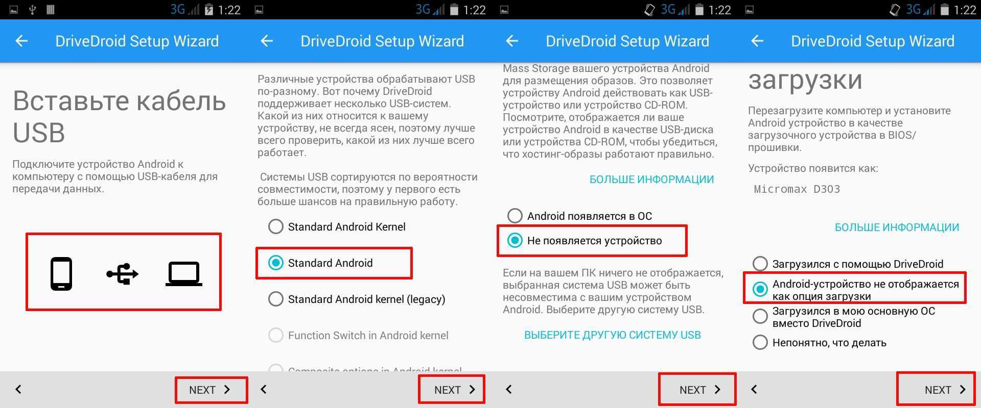 Далее соединяют телефон с ПК с помощью USB-шнура и включают его как внешний накопитель. Потом также жмут «Next». Далее в последующем окне выбирают «Standard Android» и опять жмут «Next». В следующем окне ставят «Не появляется устройство» и жмут «Next». Потом выбирают «Android-гаджет не отображается как опция нагрузки».