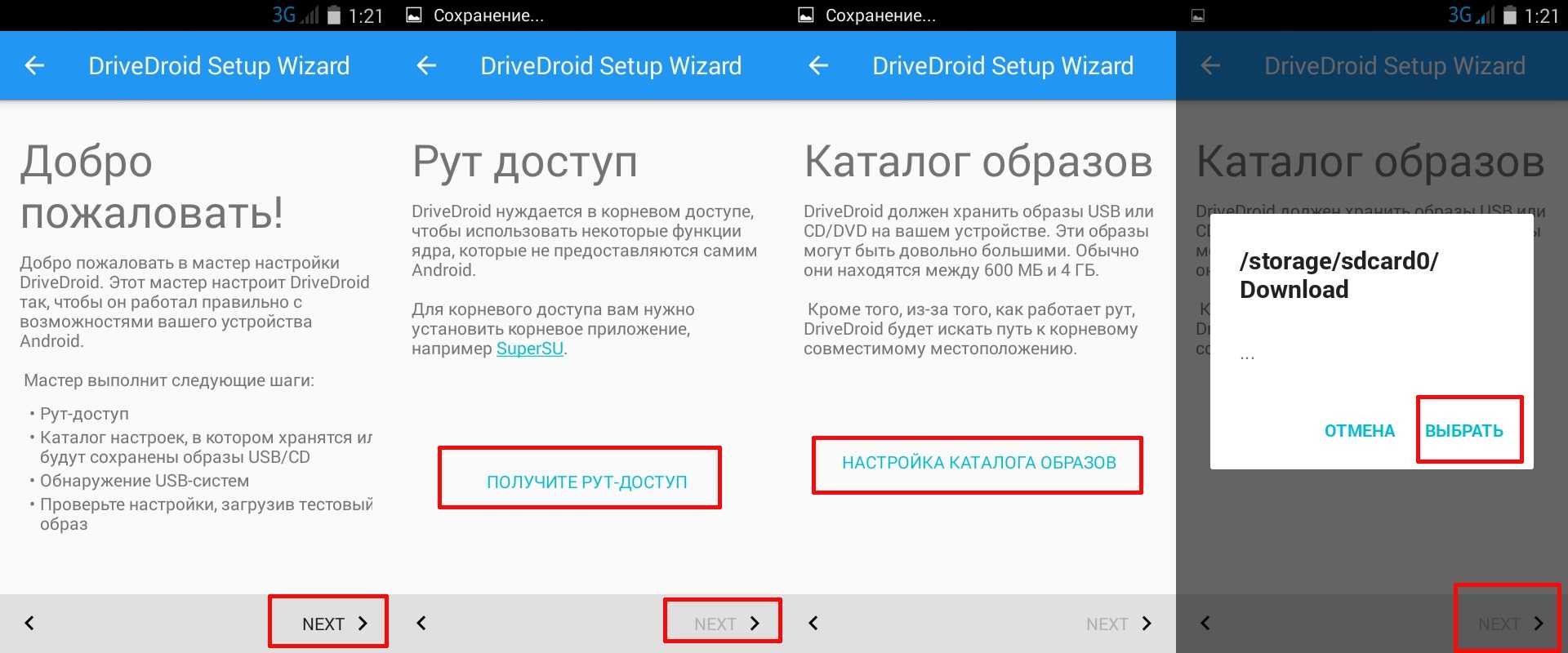 Если под рукой нет флешки или DVD-диска с Windows 7, то можно переустановить систему с помощью Android-гаджета. Для этого устанавливают на смартфон утилиту DriveDroid (желательно русифицированную версию). Загрузить ее можно в Google Play. Запускают ее. В окне приветствия нажимают «Next». Потом предоставляют программе root-доступ и снова жмут «Next». В следующем окне нажимают на вкладку «Настройка каталога образа» и опять жмут «Next».