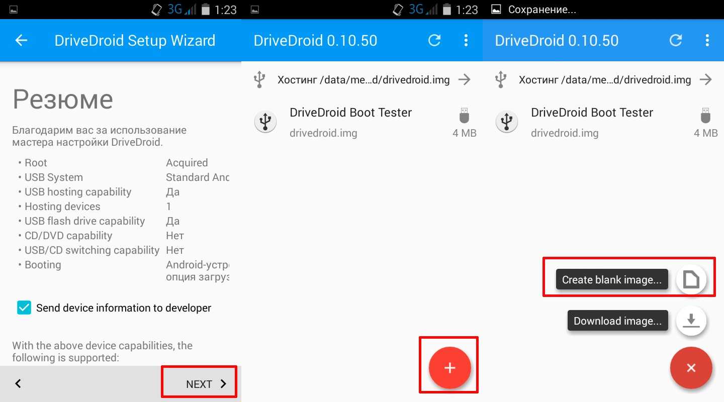 Далее появится окно с результатами, где также жмут «Next». После чего появится окно размещения на телефоне пустых ISO образов. Тут нажимают «+» и выбирают инструмент «Create blank image».