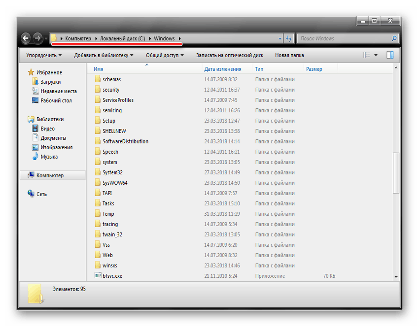 Теперь «Проводник» без проблем сможет отображать системные каталоги и их содержимое. Можно приступать к поиску исполняемого файла редактора реестра.