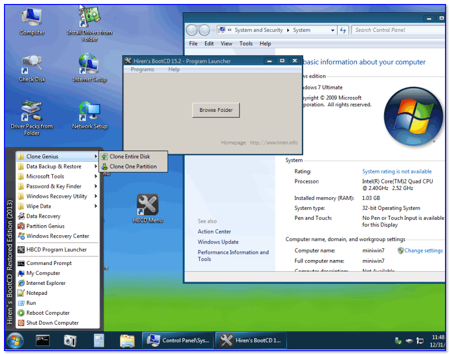 Портативная mini Windows XP – среда Live-диска для привыкших работать с инструментарием операционных систем от Microsoft. Здесь можно настроить сеть для выхода в Интернет, если компьютер не подключен к роутеру, работать с проводником Windows, командной строкой, диспетчером устройств, утилитами управления и проверки диска и т.п.
