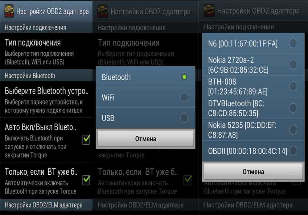 6. Откройте раздел «OBD2 настройки адаптера / Выберите устройство Bluetooth» и выберите Ваш адаптер ELM 327 Bluetooth