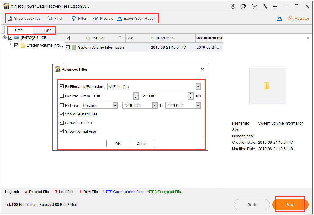 Щелкнув по Фильтр вариант, вы можете сузить диапазон поиска файлов, чтобы быстро найти нужные файлы для восстановления. А именно, вы можете фильтровать результат сканирования файла по расширению, размеру, дате и т. Д.