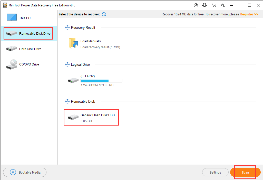Затем нажмите Съемный диск и выберите устройство SD-карты телефона и нажмите Сканировать кнопка. Это программное обеспечение для восстановления смарт-SD-карт начнет сканирование выбранной SD-карты телефона (Android).