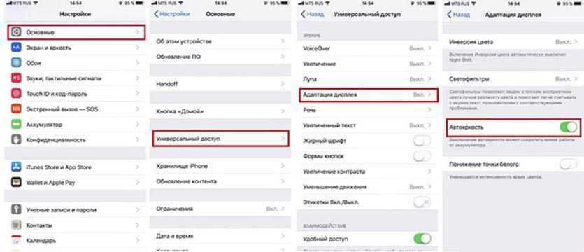 Пункт меню недавно переехал по пути Настройки – Основные – Универсальный доступ – Адаптация дисплея. Можно отключить и устанавливать яркость ниже автоматического порога. Так и датчик освещенности тратить заряд не будет и дисплей будет темнее обычного.