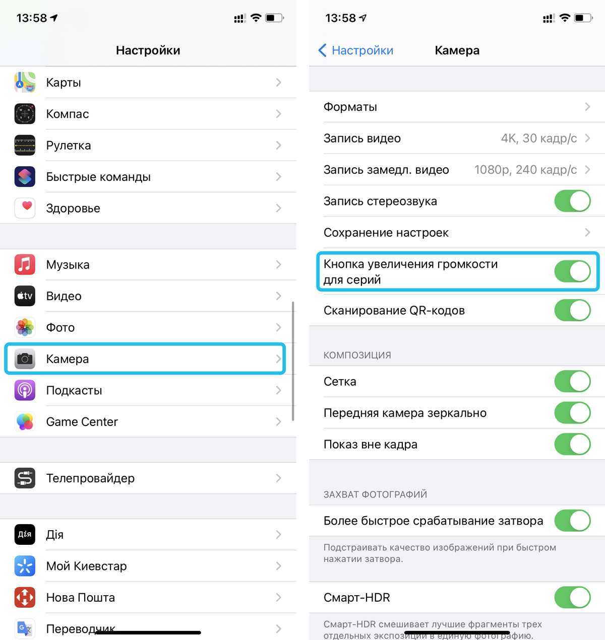 - И поставить флажок напротив «Серия фото кнопкой увеличения громкости».
