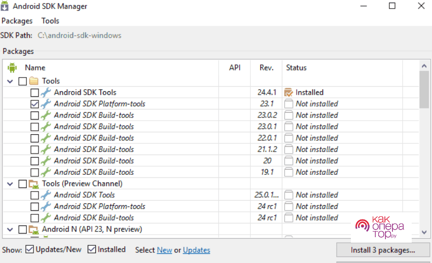Из установленной папки запустить SDK Manager установить флажок как на скриншоте ниже и кликнуть на клавишу установки.