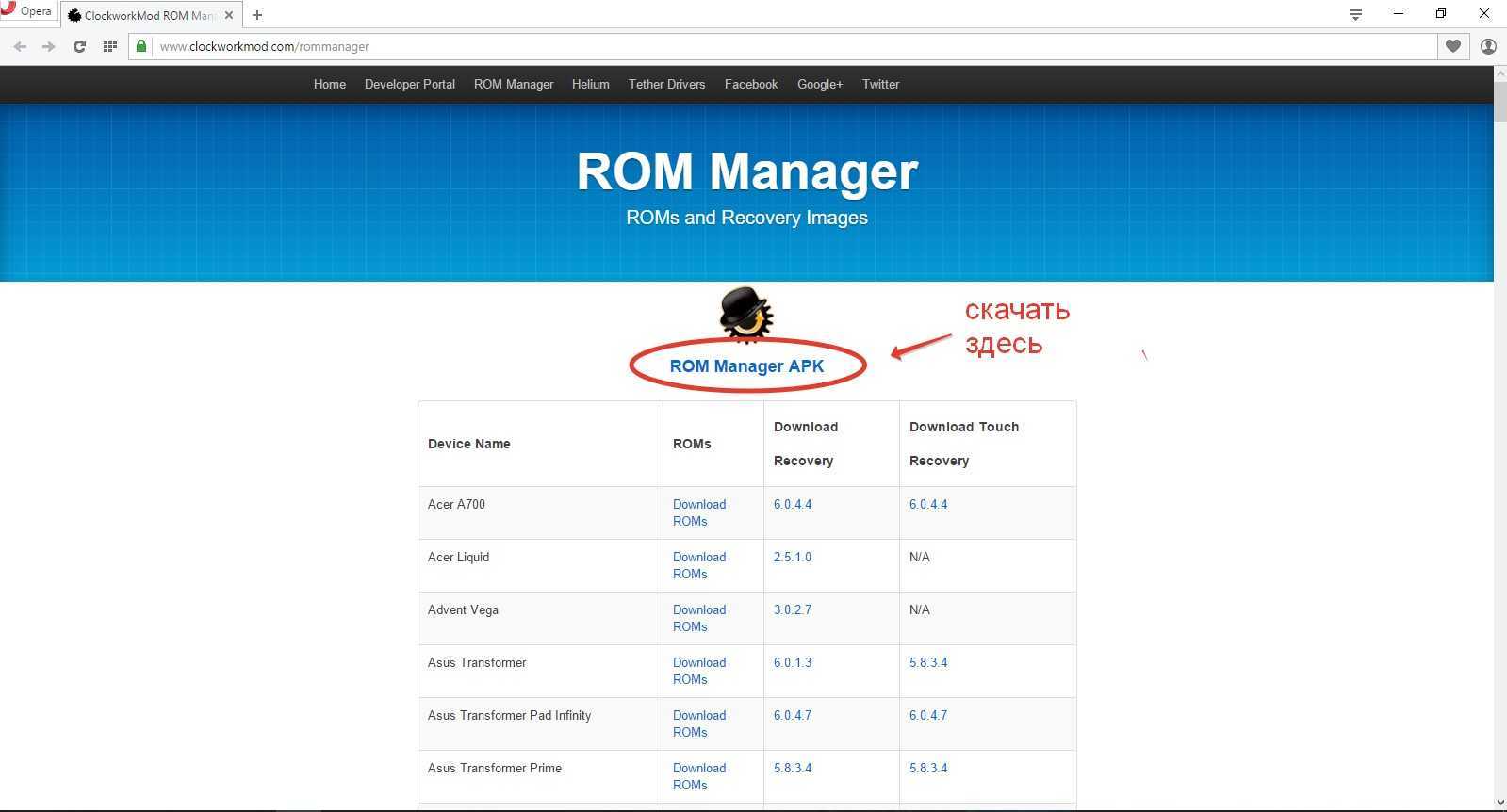 - Для начала мы должны зайти с нашего гаджета на сайт ROM Manager;