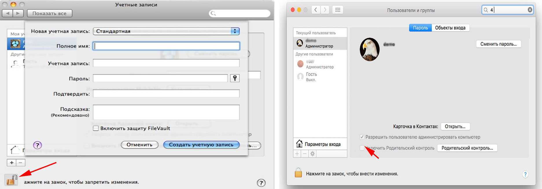 Входим в учетную запись и нажимаем на иконку «Замок», расположенную в нижнем левом углу. Теперь можете создавать новую учетную запись для вашего чада. И не забудьте установить птичку напротив строки «Включить родительский контроль».