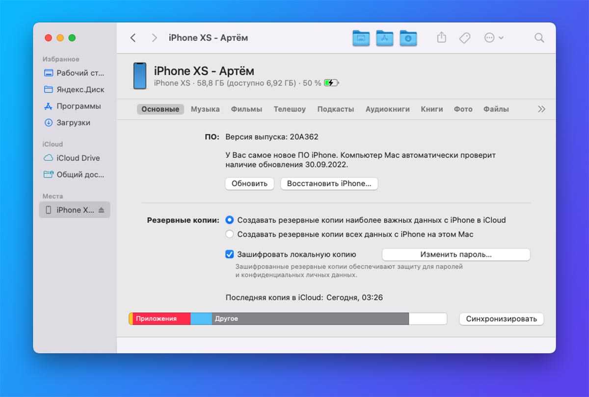 Для создания бекапа потребуется подключить iPhone при помощи кабеля и открыть Finder (в macOS Catalina и новее) или iTunes (в более старых версиях системы). Там увидите подключенный смартфон и кнопку Создать резервную копию сейчас для создания полной резервной копии.