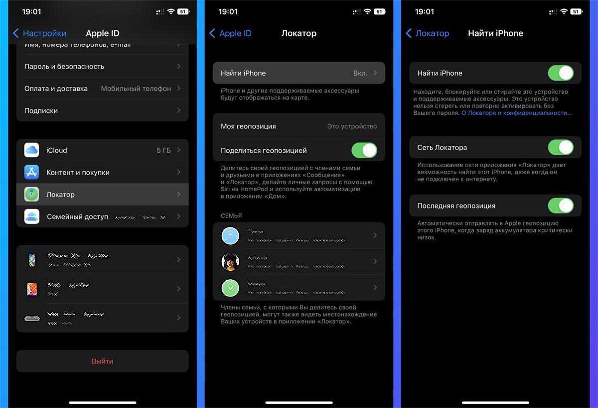 ◈ Отключите опцию Найти iPhone по пути Настройки – Учетная запись Apple ID – Локатор – Найти iPhone.