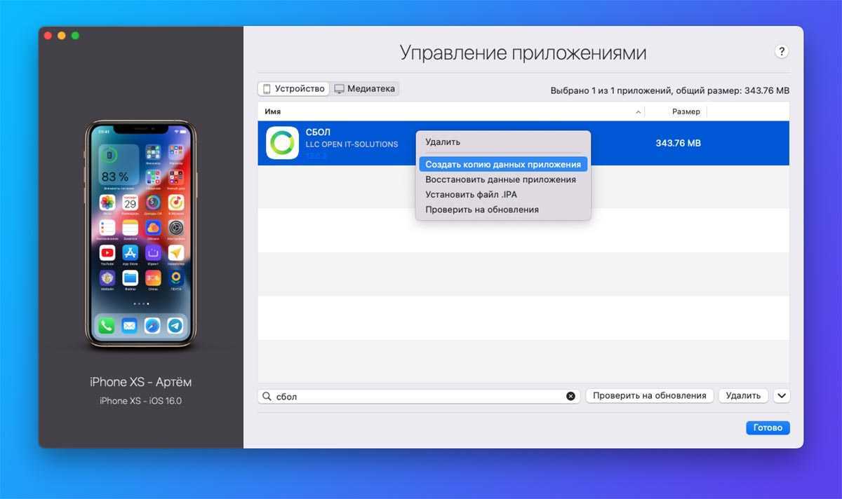 Найдите нужную программу и выберите пункт Создать копию данных приложения из контекстного меню.
