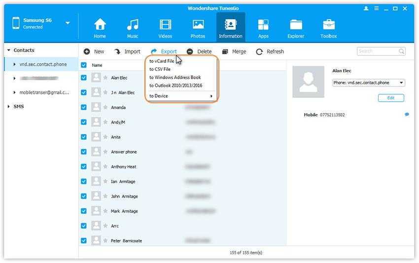 - Откройте Wondershare TunesGo приложение и нажмите на «Информацию» вкладку и выберите все или выбранные контакты, которые требуется экспортировать. Нажмите кнопку «Экспорт», а затем выберите «vCard файл» из 4 вариантов…
