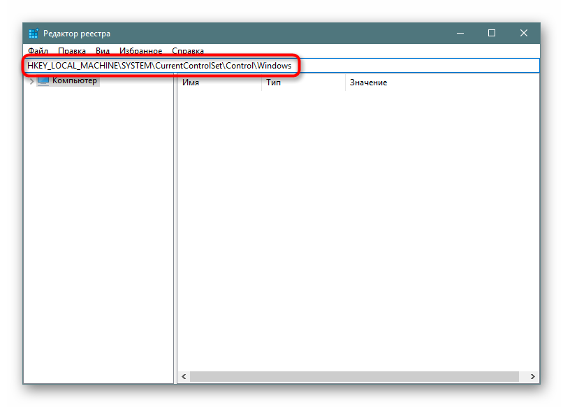 - откроется редактор реестра, где нужно пройти по ветке HKEY_LOCAL_MACHINE\SYSTEM\CurrentControlSet\Control\Windows;