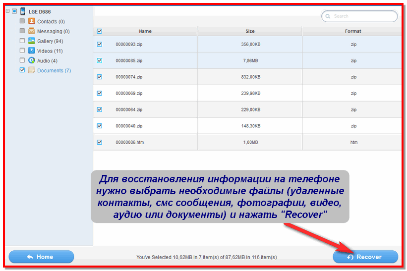 Данное приложение сканирует несколько разделов смартфона: галерею, контакты, сообщения, музыку, документы, различные архивы, заметки, видео, а также папки, недавно удалённые на андроиде.