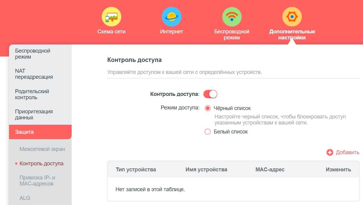 Фильтрация по МАК-адресам находится в разделе «Защита» – «Контроль доступа». После включения вы увидите два списка: