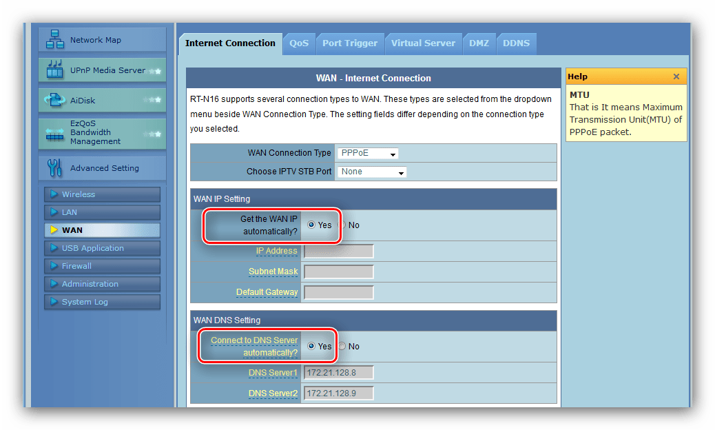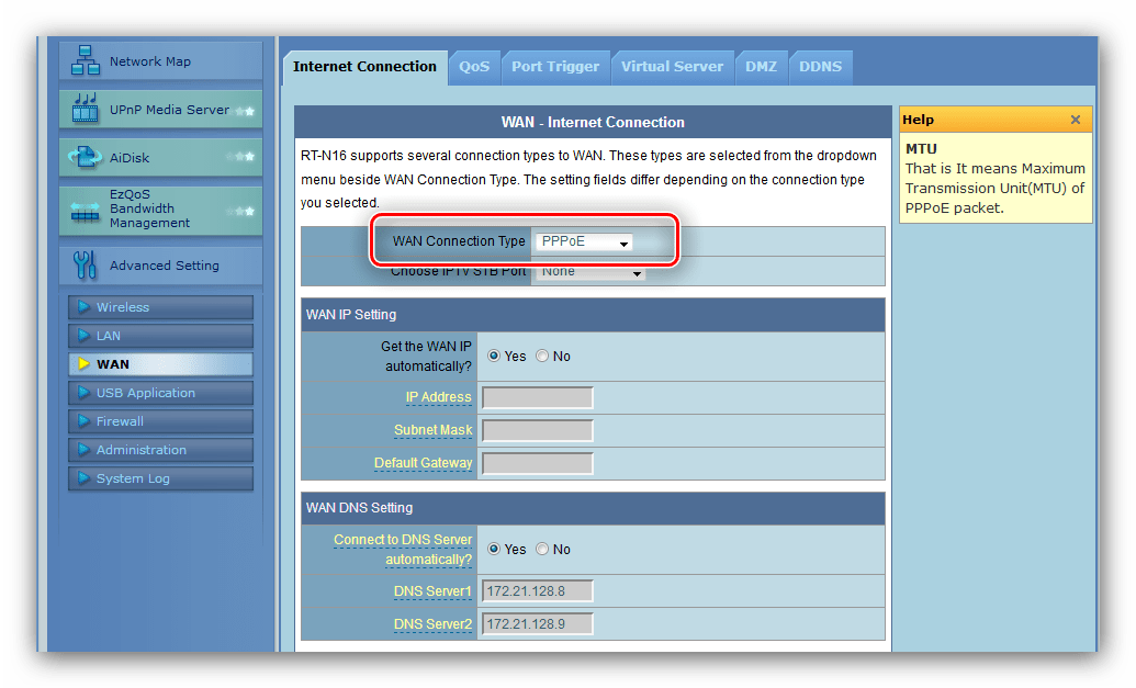 В этой вкладке можно выбрать тип WAN-подключения: статический IP, динамический IP, PPPoE, PPTP или L2TP. Пункт «Выбор порта IPTV STB» даем нам возможно принудительно указать, к какому из lan портов подключено устройство преобразования интернет сигнала в телевизионное изображение. Настройка роутера asus 520gc