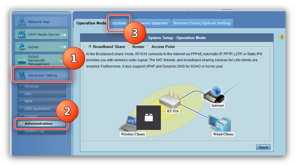 Пункт «Дополнительные настройки» подпункт «администрирование» в меню настроек роутера WL-520GU