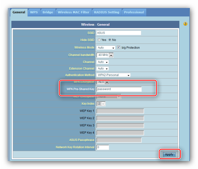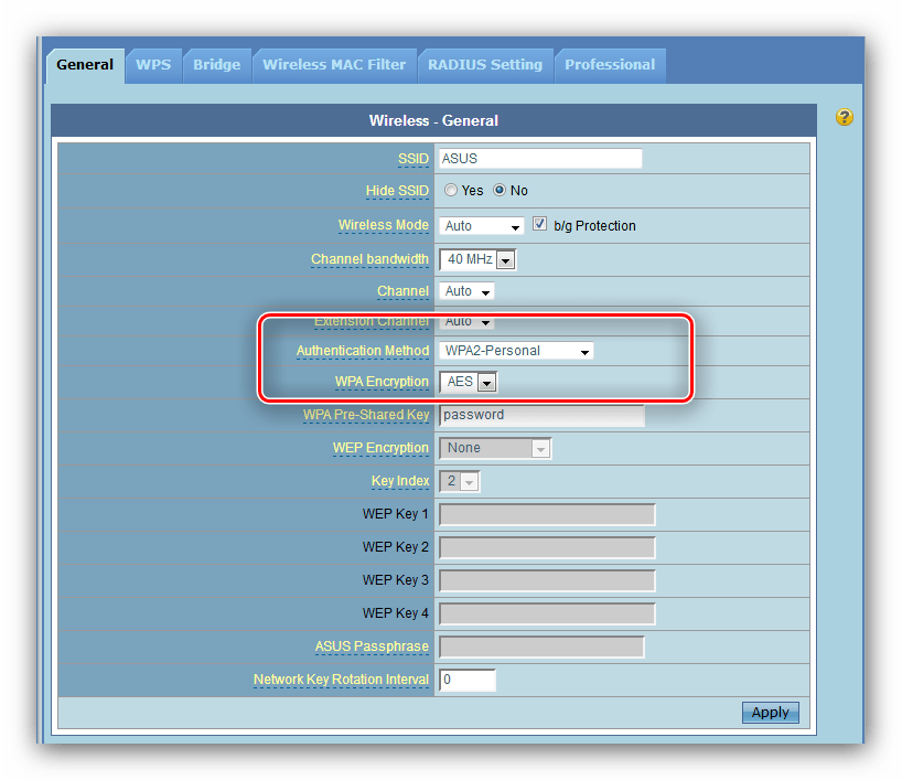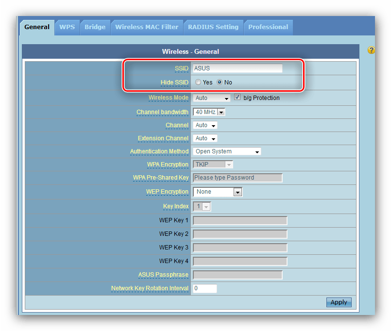 Пункт «Беспроводная сеть» подпункт «Профессионально» в меню настроек роутера WL-520GU