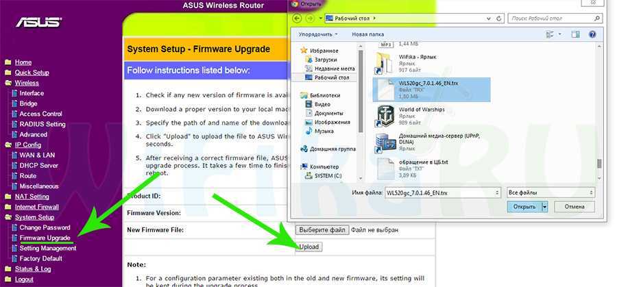 Заходим в роутере в раздел «System Setup > Firmware Upgrade», кликаем на кнопку «Выбрать файл», выбираем прошивку с компа и жмем «Upload». Если