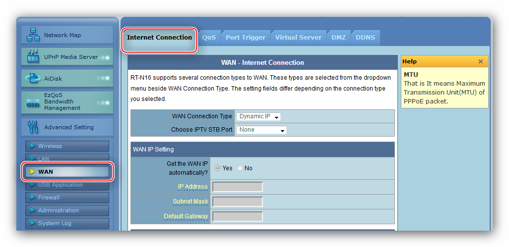 Пункт «Дополнительные настройки» подпункт «WAN» в меню настроек роутера WL-520GU