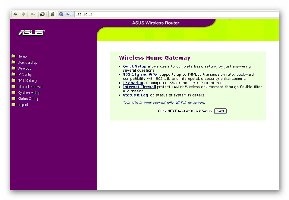 Так или иначе откроется главная страница конфигуратора. Отметим важный нюанс – новейший вариант прошивок ASUS WL-520GC имеет встроенную утилиту быстрой настройки, но она нередко работает со сбоями, поэтому приводить этот способ конфигурирования мы не будем, и перейдём сразу к ручному методу.