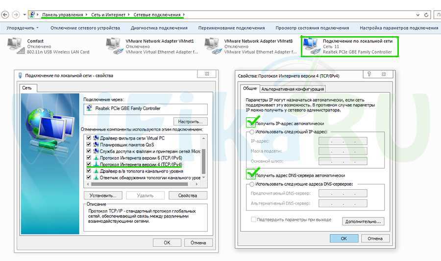 После этого заходим в настройки подключения по локальной сети Windows и ставим флажки на получение IP и DNS в автоматическом режиме.