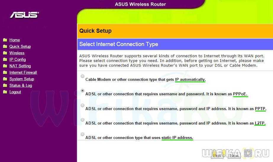 Далее от вас потребуется выбрать (у каждого провайдера могут быть свои требования). В случае с PPPoE и PPTP нужно будет подготовить данные для подключения (логин, пароль, DNS и другие данные в зависимости от типа подключения и провайдера).