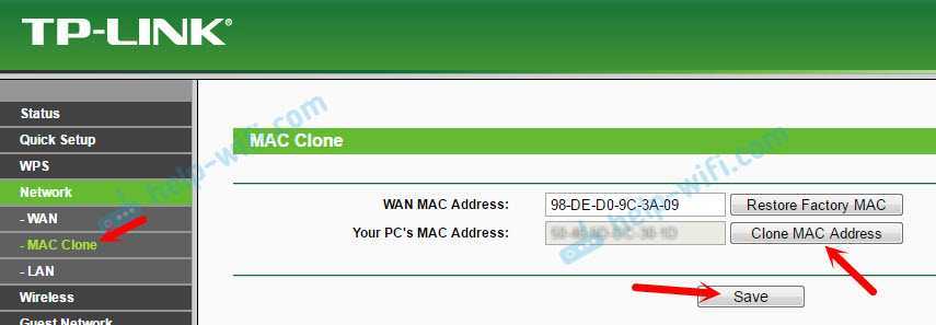Некоторые провайдеры делают привязку интернета к MAC-адресу. И если у вас интернет был привязан к компьютеру, к которому сейчас подключен роутер, то можно попробовать клонировать MAC с компьютера. Это можно сделать на вкладке «Network» (Сеть) – «MAC Clone». Нажав на кнопку «Clone MAC Address».
