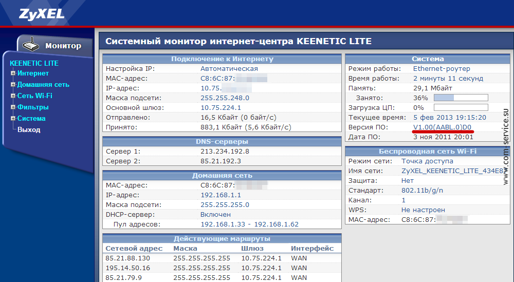 Этот мануал является первым в серии инструкций по настройке Zyxel Keentic II (V2). Базовая настройка практически идентична для всех версий Keenetic — как простого, так и Giga, Lite, 4G. Базовая настройка Keenetic II для подключения к Билайн. IP-адрес WiFi-роутера Zyxel в локальной сети такой же, как и в первой версии — http://192.168.1.1, логин и пароль так же идентичны: admin / 1234. Попадаем в раздел «Монитор»: