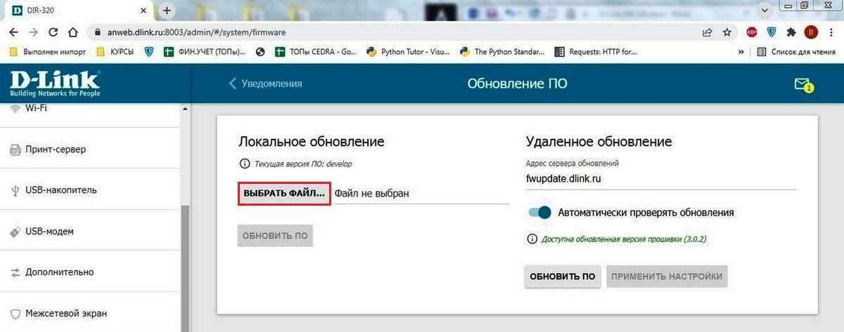 Здесь же вы можете установить свою прошивку, которая была ранее загружена вами. Кликните команду «Выбрать файл», укажите путь к нужной папке и выполните установку обновления. При этом устройство автоматически перезагрузится после установки данного обновления.
