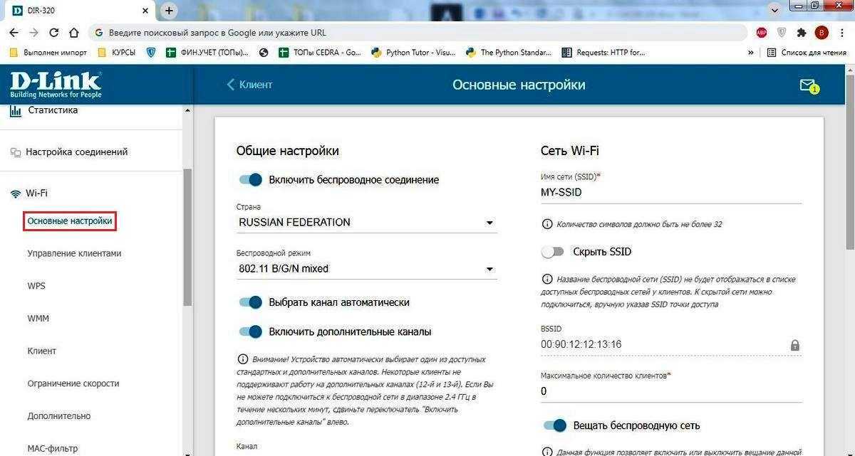 В модели D-Link ДИР 320/А, как в принципе и в любом другом маршрутизаторе, можно установить дополнительные параметры беспроводного режима. Для этого откройте раздел «Wi-Fi» в меню слева, а потом выберите вкладку «Основные настройки».