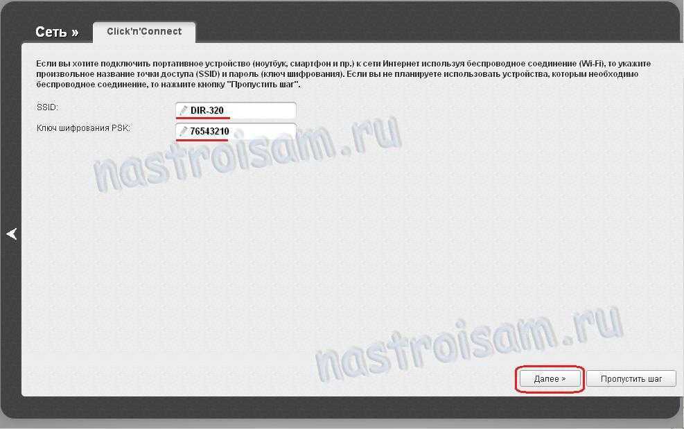 Нажимаем кнопку Далее, чтобы перейти к базовой настройке беспроводной сети Wi-Fi на DIR-320 NRU: