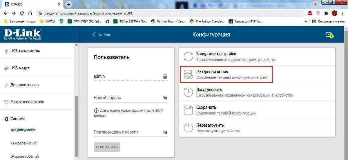 Для создания файла откройте раздел «Система» перейдите во вкладку «Конфигурация». Нажмите команду «Резервная копия» и она автоматически загрузится в указанную вами папку на компьютере.