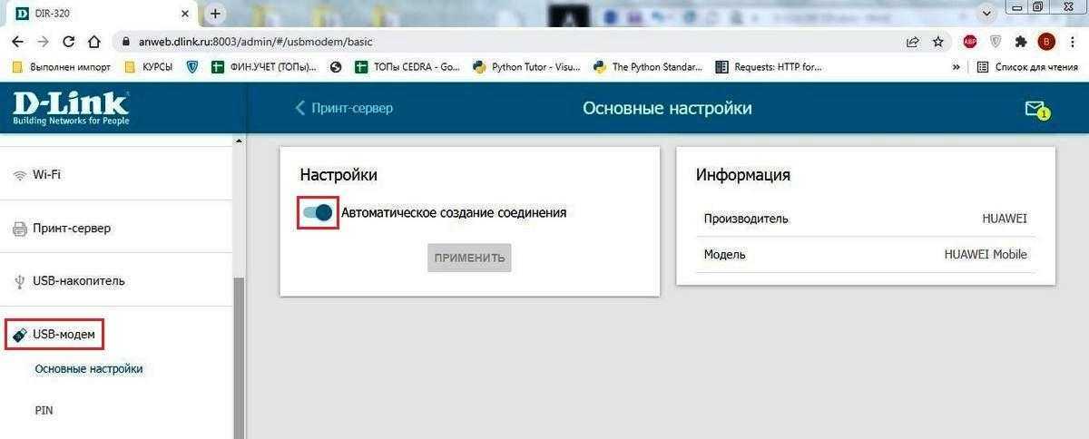 При подключении модема через USB порт, роутер автоматически определяет модель устройства. После этого достаточно активировать бегунок около строки «Автоматическое создание соединения». Роутер потом начинает раздавать по беспроводной сети интернет, который принимает модем.