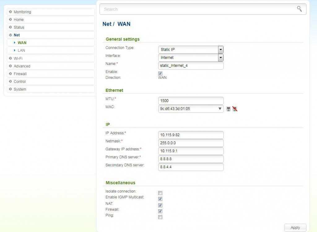 Подключение со статическим IP производится похожим способом. При выборе значения «Статический» в разделе «Тип интерфейса» появляются новые текстовые поля: IP-адрес, маска сети, MAC-адрес. Все эти данные также предоставляются провайдером.