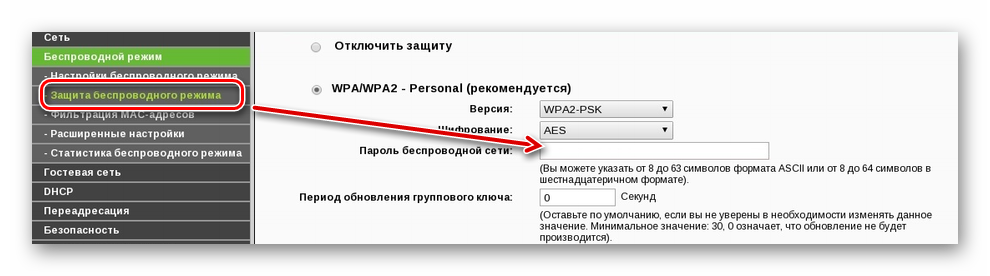 Появится WEB-интерфейс. В меню слева найдите пункт «Беспроводной режим» и в открывшемся списке выберите «Защита беспроводного режима».