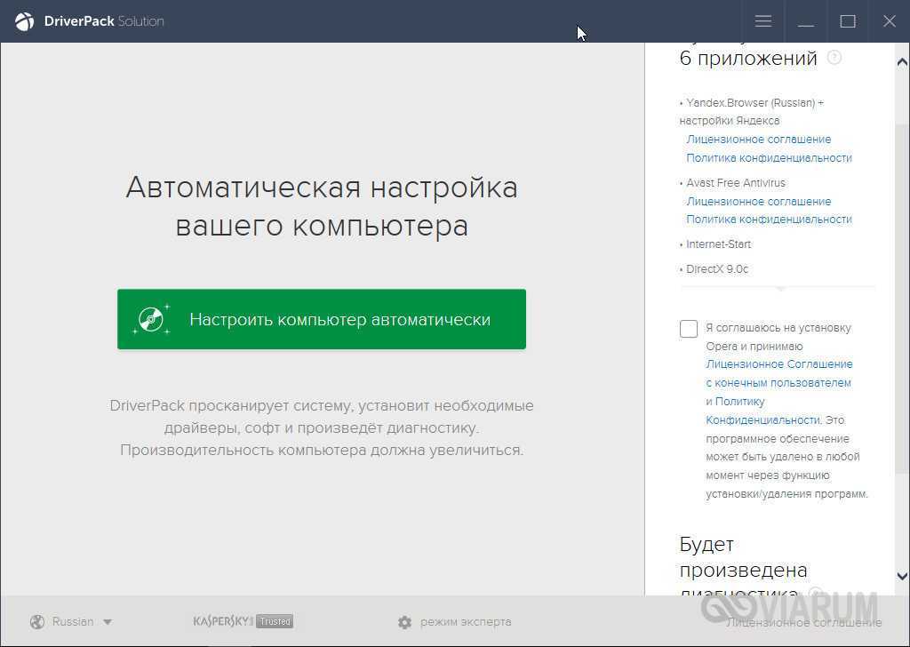 DriverPack Solution может работать как в онлайн, так и в автономном режиме, позволяющем устанавливать драйвера без подключения компьютера к интернету, но вам заранее нужно будет скачать соответствующий пакет DriverPack Solution для вашей версии операционной системы и перенести его на компьютер любым удобным способом. Возможен запуск с переносного носителя. Работать с DriverPack Solution желательно в экспертном режиме, так как помимо драйверов менеджер устанавливает дополнительный бесплатный софт.