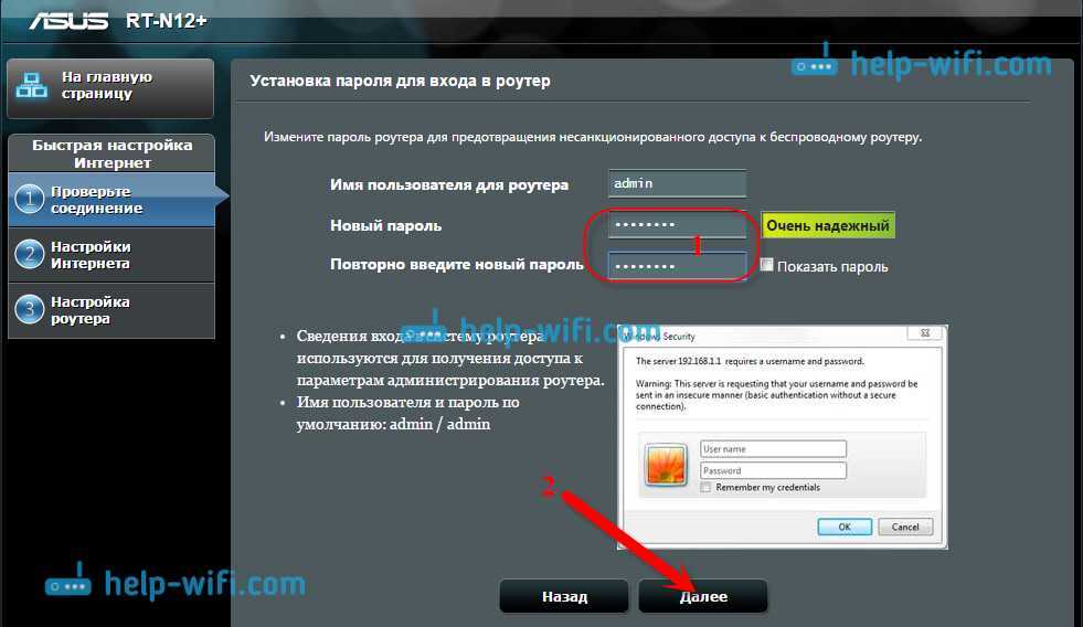 После нажатия на кнопку «Перейти» появится страница для установки пароля. Здесь нужно выбрать новый пароль для входа в роутер. Данный пароль пройдется вводить каждый раз, когда вы захотите изменить настройки роутера. Поэтому нужно выбрать что-то такое, что вам будет легко запомнить. При этом пароль не должен быть слишком короткими или слишком простым. Вводим пароль и нажимаем на кнопку «Далее» для того чтобы перейти к следующему этапу автоматической настройки.