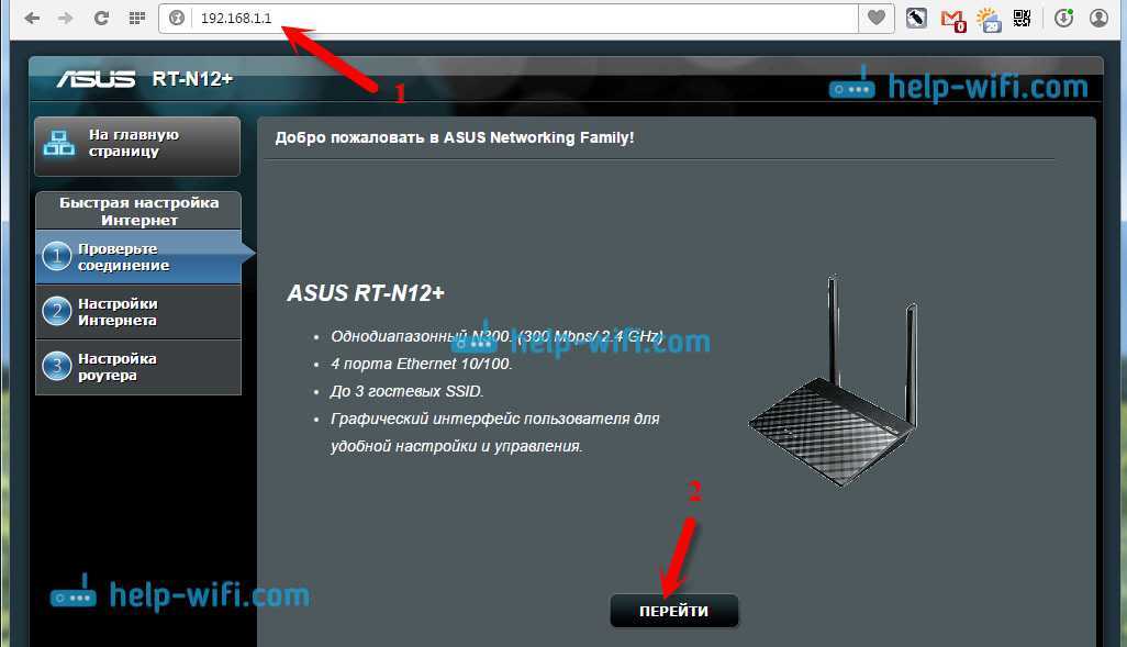 Для того чтобы запустить автоматическую настройку роутера ASUS RT-N12 достаточно просто открыть браузер. Если вы правильно подключили все кабели к роутеру, то автоматическая настройка должна сама появиться окне браузера. Если в окне браузера появилось вот такое окно, как на скриншоте ниже, значит все нормально. Нажимайте на кнопку «Перейти» и продолжайте настройку роутера в автоматическом режиме. Если же по каким-то причинам автоматическая настройка не запустилась, то введите в адресную строку браузера IP адрес роутера 192.168.1.1 и страница с автоматической настройкой роутера должна появиться. Если роутер уже настраивался ранее, то запустить автоматическую настройку можно с помощью кнопки «Быстрая настройка Интернета» в веб-интерфейсе.
