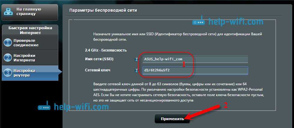 Следующий шаг — это настройка Wi-Fi сети. Здесь нужно ввести только название вашей Wi-Fi сети (можно оставить просто ASUS или ввести любое другое имя) и пароль для доступа к Wi-Fi (сетевой ключ). Остальные настройки роутер установит автоматически. По умолчанию, используется способ защиты WPA2-Personal AES. Данный способ защиты является оптимальным для домашнего использования. Поэтому в большинстве случаев никаких ручных настроек после завершения работы автоматической настройки – не требуется.