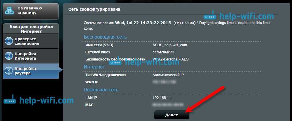 На этом автоматическая настройка роутера ASUS RT-N12 завершена. На экране появится информация о текущих настройках. Здесь просто нажимаем на кнопку «Далее».